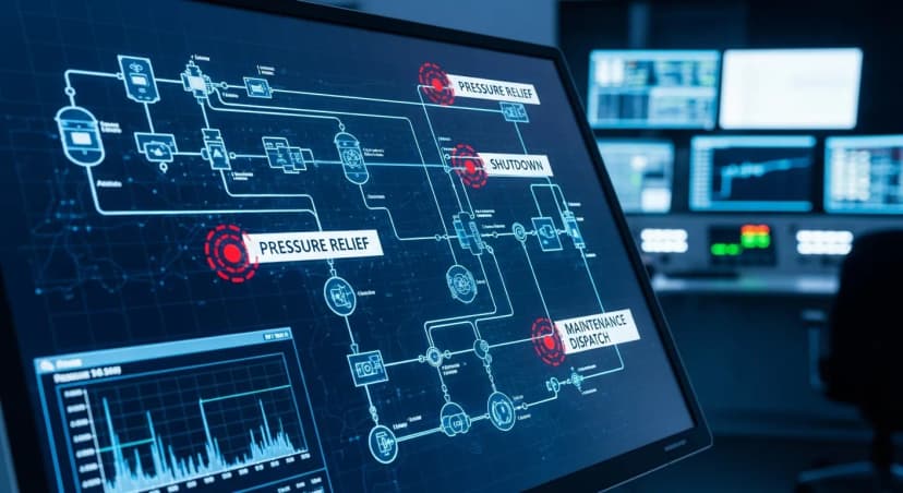Suggests corrective actions like pressure relief, shutdowns, or maintenance dispatches.